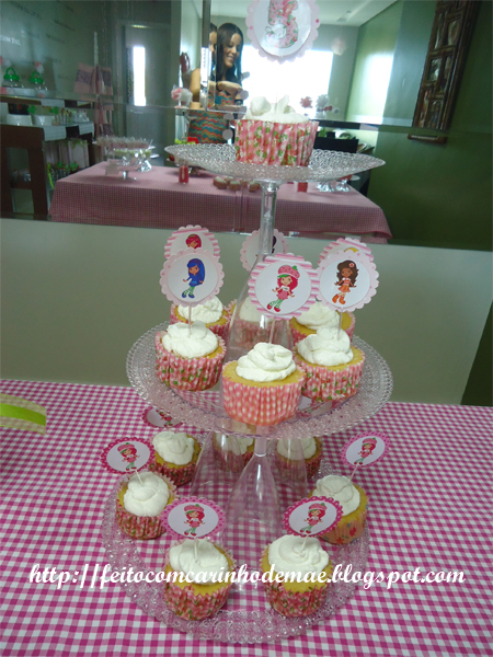 Sacolinha com o caderno de pintura, porta-treco com os lápis de ponteira, caixa morango com adesivos da turminha da Moranguinho, toppers para ofica de cupcakes (contribuição da minha amiga Lari), e as caixinhas de acrílico para cupcakes, com tags de agradecimento.
